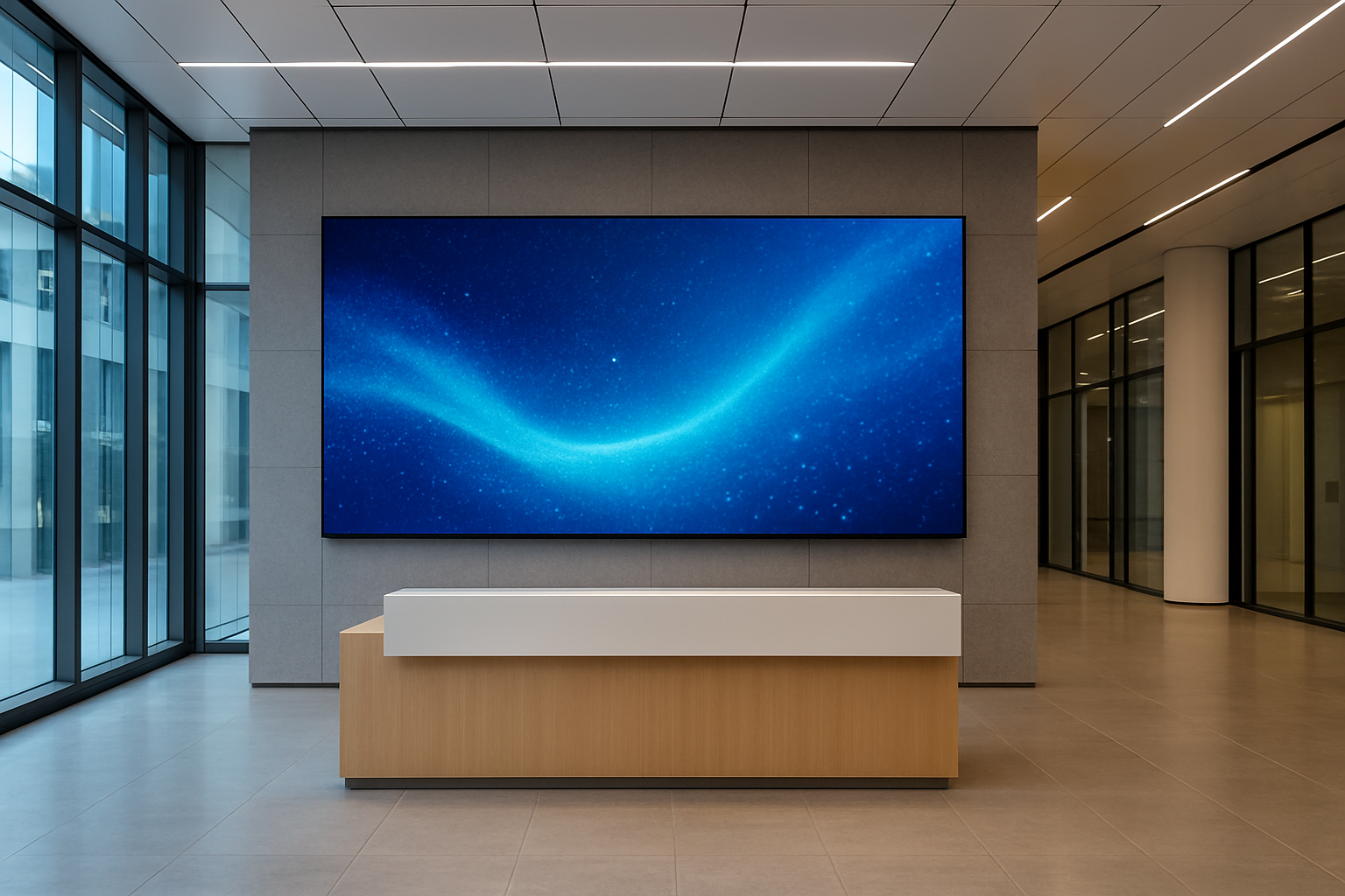 Ein moderner Empfang ist die Visitenkarte eines Unternehmens. Mit großformatigen LED-Wänden lassen sich Besucher und Mitarbeiter bereits beim Betreten der Eingangshalle mit eindrucksvollen Bildern, Videos oder Unternehmensbotschaften begrüßen. Ob für Branding, aktuelle Informationen oder Imagefilme – LED-Wände bieten maximale Flexibilität, brillante Darstellung und schaffen ein professionelles, einladendes Ambiente.